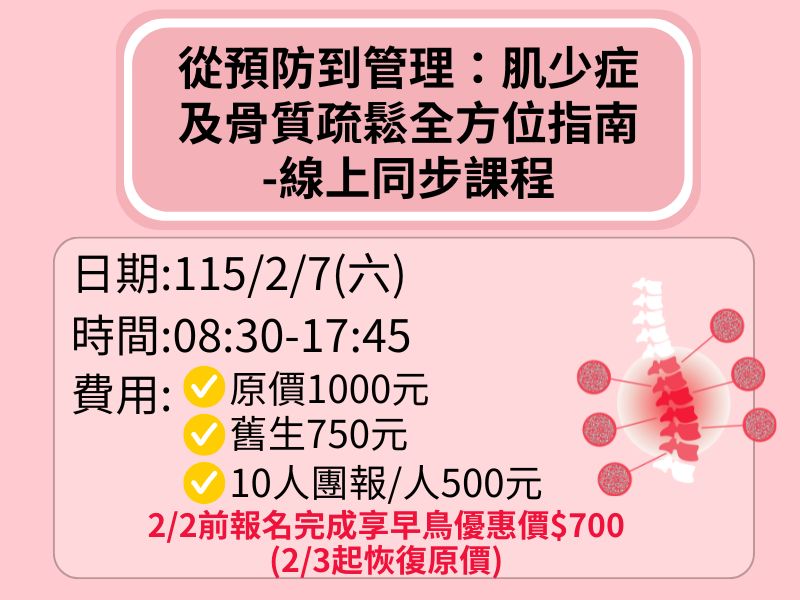 從預防到管理:肌少症及骨質疏鬆全方位指南-線上同步課程【直播視訊】-❤️11/13前享早鳥優惠700元 |