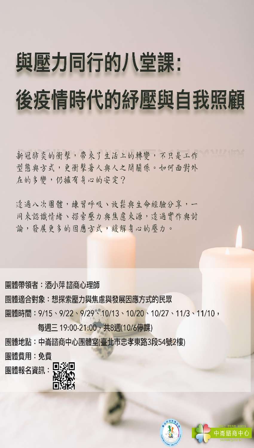透過八次團體,練習呼吸、放鬆與生命經驗分享,一同來認識情緒、探索壓力與焦慮來源,透過實作與討論,發展更多的因應方式,緩解身心的壓力。