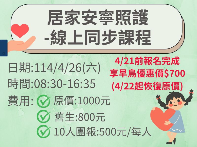 如欲報名請依照下列步驟完成報名: 1.填完表單同意後 2.完成繳費 3.加本會官方LINE@回報報名的課程名稱與日期、交易成功單據、長照小卡 4.等待通知 5.收到【報名成功通知】後才是報名成功並保有名額。 【線上同步課程】居家安寧照護(7小時) 報名表單:https://forms.gle/3ayj1cabwk2XGWYX6 上課日期: 第二梯:114/4/26(六),08:30-16:35 ❤️(第二梯)4/21前報名完成,享早鳥優惠價$700(4/22起恢復原價) *【本課程核發電子證書】 完成所有報名步驟,才會收到我們的報名成功通知唷~
