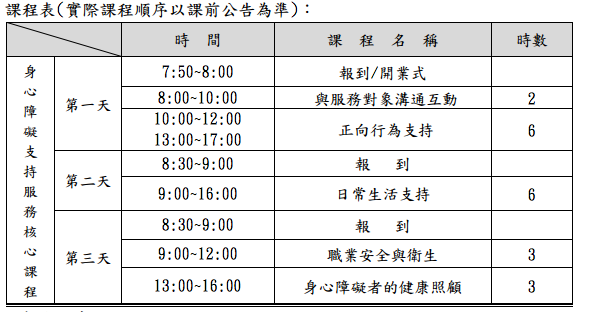 本會依據衛 生 福 利 部 因 應 考 量 失 能 身 心 障 礙 者 照 顧 需 求,訂 定「 身 心 障 礙 支 持 服 務 核 心 課 程 訓 練 」 (以 下 簡 稱 身 障 核 心 課 程 ), 透 過 課 程 內 容 增 進 第一線 照 顧 服 務 員 對 身 障 者 身 心 靈 照 顧 概 念 提 升 , 藉 由 核 心 課 程 如 職 業 安 全 認 知 、 健 康 照 顧 、 溝 通 及 提 供 服 務 對 象 正 向 行 為 支 持 、 日 常 生 活 支 持 技 巧 , 促 進 照 顧 服 務 員 對 於 身 障 者 之 知 能 提 升 。