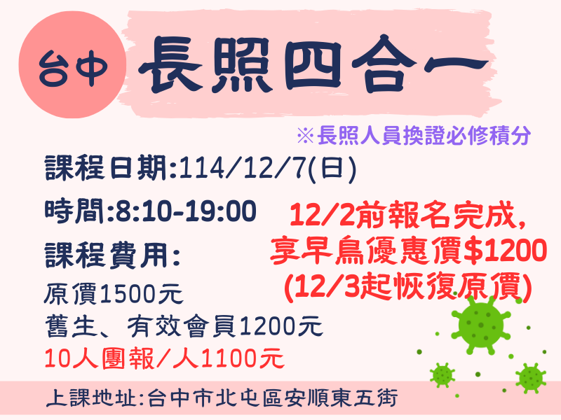 【台中】長照四合一 https://forms.gle/2Uzufq9DrYF26fkS9 上課日期/時間:(第三梯)114/12/7(日),08:10-19:00 ❤️(第三梯)12/2前報名完成,享早鳥優惠價1200元 *【本課程核發電子證書】 *為響應政府節能減碳環保無紙化政策 ,此課程無紙本講義。 完成所有報名步驟,才會收到我們的報名成功通知唷~