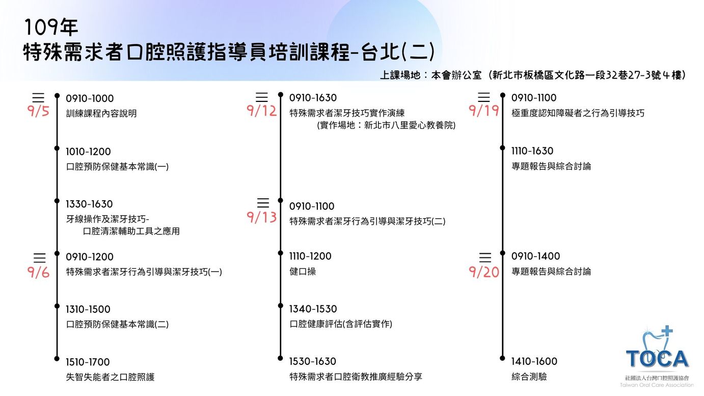 https://www.toca.org.tw/109%E5%B9%B4%E7%89%B9%E6%AE%8A%E9%9C%80%E6%B1%82%E8%80%85%E5%8F%A3%E8%85%94%E7%85%A7%E8%AD%B7%E6%8C%87%E5%B0%8E%E5%93%A1%E5%9F%B9%E8%A8%93%E8%AA%B2%E7%A8%8B-%E5%8F%B0%E5%8C%97%E4%BA%8C.html?fbclid=IwAR0G6GEg5DGe2M67iAj9cVvU5qR2jzR61s5kNuZkgSVRpl11HVXy16yv6Fg