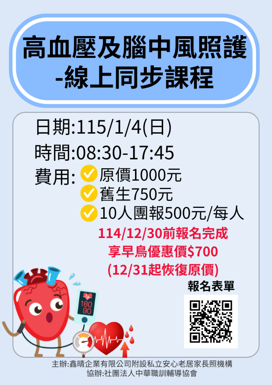 ❤️同時報名《1/3(六)癲癇照護7H(線上同步課)+1/4(日)高血壓及腦中風照護7H(線上同步課)》,兩堂優惠1200元。**此優惠需於報名時一併繳費,分次報名繳費者無法享有優惠**