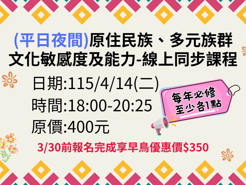 【線上同步課程】原住民族、多元族群文化敏感度及能力(2小時) https://forms.gle/FuFknm3XUTGJM4MT9 上課日期:(第一梯)夜間115/4/14(二),18:00-20:25 ❤️(第一梯)平日夜間3/30前報名完成,享早鳥優惠價$350 ❤️(20小時舊生:100元):指114年度曾參加本會長照積分課程20小時(含)以上且已經完訓者。 ❤️(15小時舊生:200元):指114年度曾參加本會長照積分課程15小時(含)以上且已經完訓者。 *【本課程核發電子證書】 *換證必修 完成所有報名步驟,才會收到我們的報名成功通知唷~