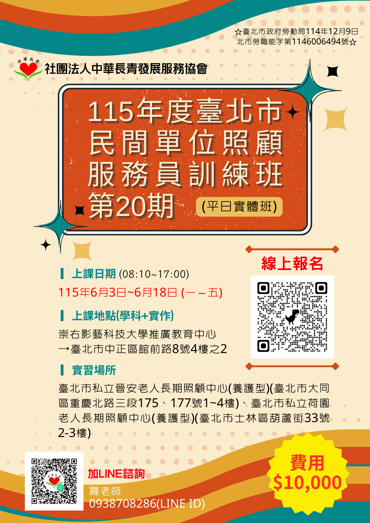 🎉115年度臺北市照顧服務員訓練班第 20 期(平日實體班)招生中🎉