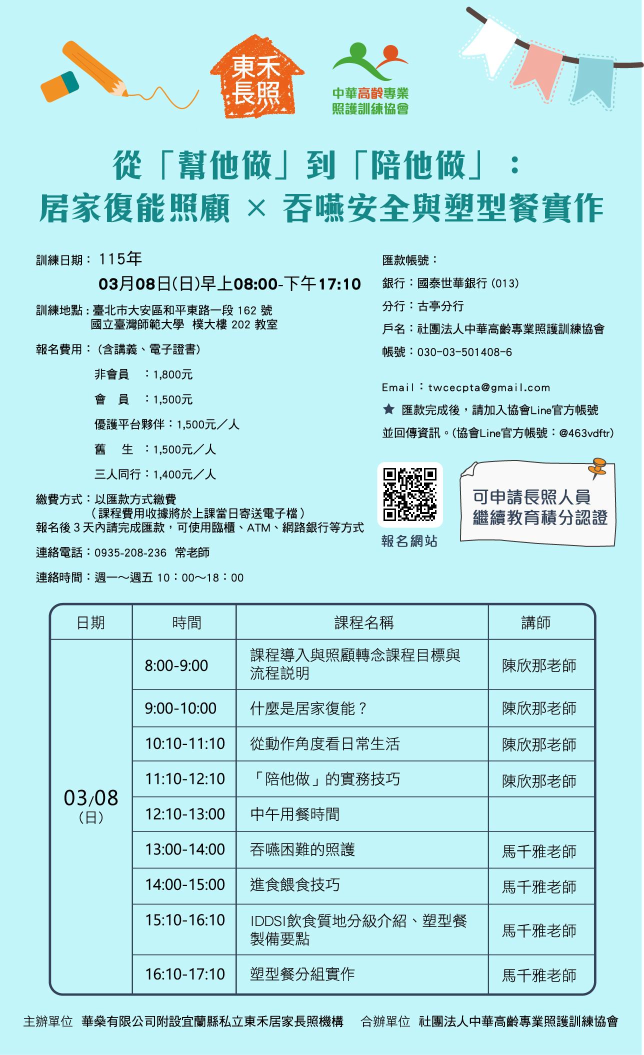 課程將從居家復能照顧的核心觀念出發,透過貼近居家現場的日常生活案例,學習如何在「安全」的前提下,引導個案參與動作、維持功能、保有尊嚴🤍