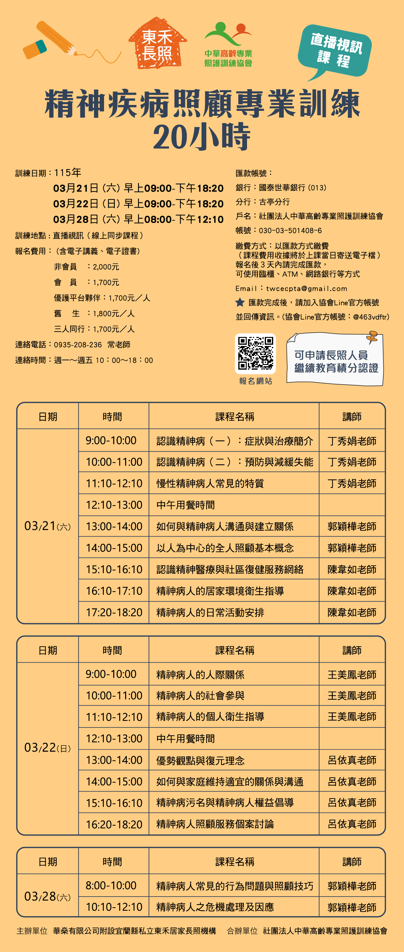 因此,協會特別帶來此堂「精神疾病照顧專業訓練 20 小時」直播視訊課程,