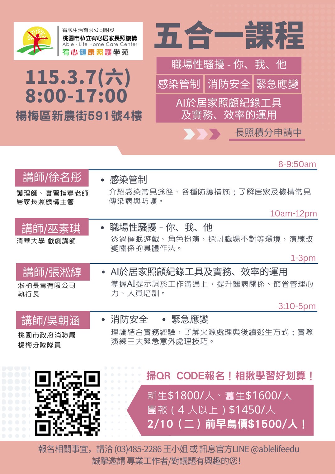 五合一課程【感染管制、職場性騷擾-你、我、他、AI於居家照顧紀錄工具及實務、效率的運用、消防安全、緊急應變】