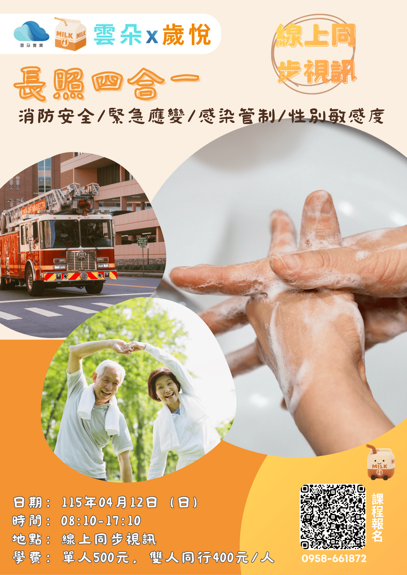 課程名稱:線上同步視訊-長照四合一(消防安全、緊急應變、感染管制、性別敏感度)